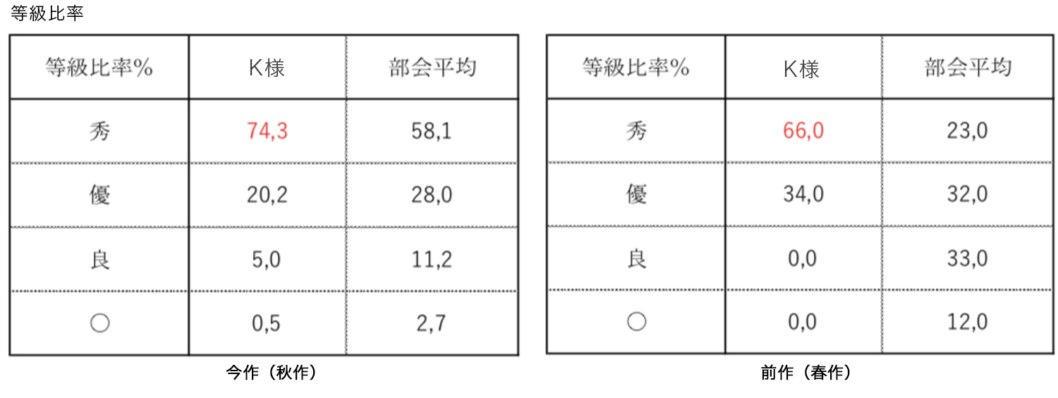 今回の結果から得られたデータを活かし、次作では秀品率・階級比率ともに高い数値を目指してまいります。今後の報告にご期待ください。
