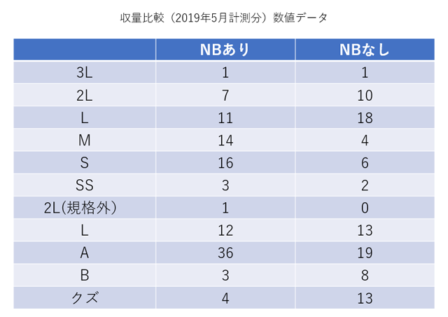 ・ロス数に関しては、 慣行区のほうが、商品化できないものの数が3.25倍多かったため、全体の収量としてはナノバブルありの方が、多い結果となった。