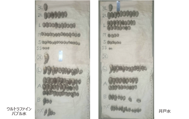 ・3株をランダムで抽出し、個数を比較したところ、ナノバブルありの方が「A」サイズの収量が、慣行区に比べ1.9倍多かった。