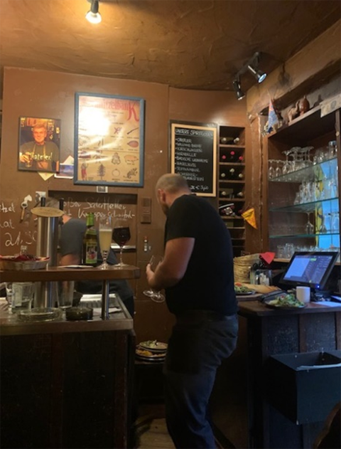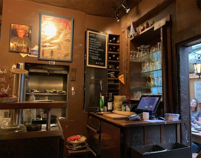 旅に出ると私は、国内でも海外でも地元の居酒屋に行くのが習慣となっている。居酒屋に入り、その店の大将や女将、あるいは、同席したお客と会話するのが楽しみだからだ。酒や肴や言葉にその地域特有のアクセントがあれば、「旅にきている」との最高な気持ちになるからだ。今回もハイデルベルグのワインバーWeinstube Schnitzelbankに向った。ドアを開けドイツ語は話せないので人差し指を上げ「one」といった。人のよさそうな店のおじさんが大きく頷いた。不安を感じさせないさりげない普通の対応だ。この普段着の対応が旅人を安心した気持ちにさせてくれる。これは日本でも外国でも同じようだ。